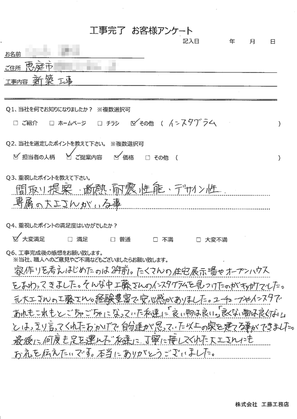 家作りを考えはじめたのは2年前。たくさんの住宅展示場やオープンハウスをまわってきました。 そんな中、工藤さんのインスタグラムを見つけたのがキッカケでした。 元大工さんの工藤さん。経験豊富で安心感がありました。ユーチューブやインスタで、あれもこれもとごちゃごちゃになっていた私達に 「良い物は良い。」「良くない物は良くない。」とはっきり言ってくれたおかげで自分達が思っていた以上の家を建てる事ができました。 最後に何度も足を運んた私達に丁寧に接してくれた大工さんにも、お礼を伝えたいです。 本当にありがとうございました。